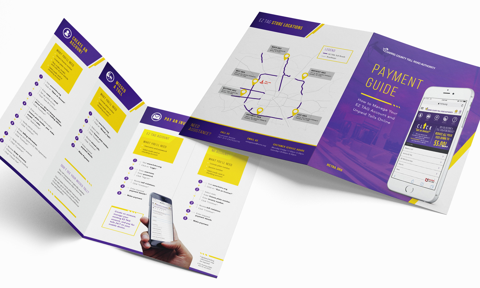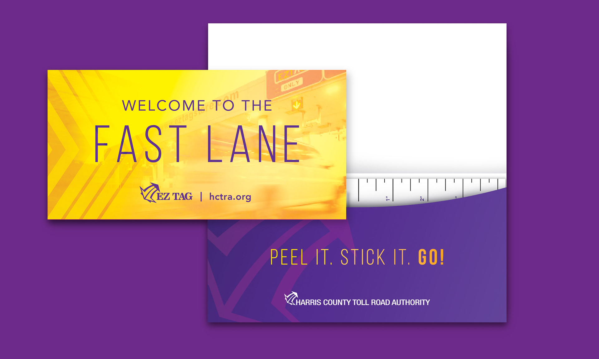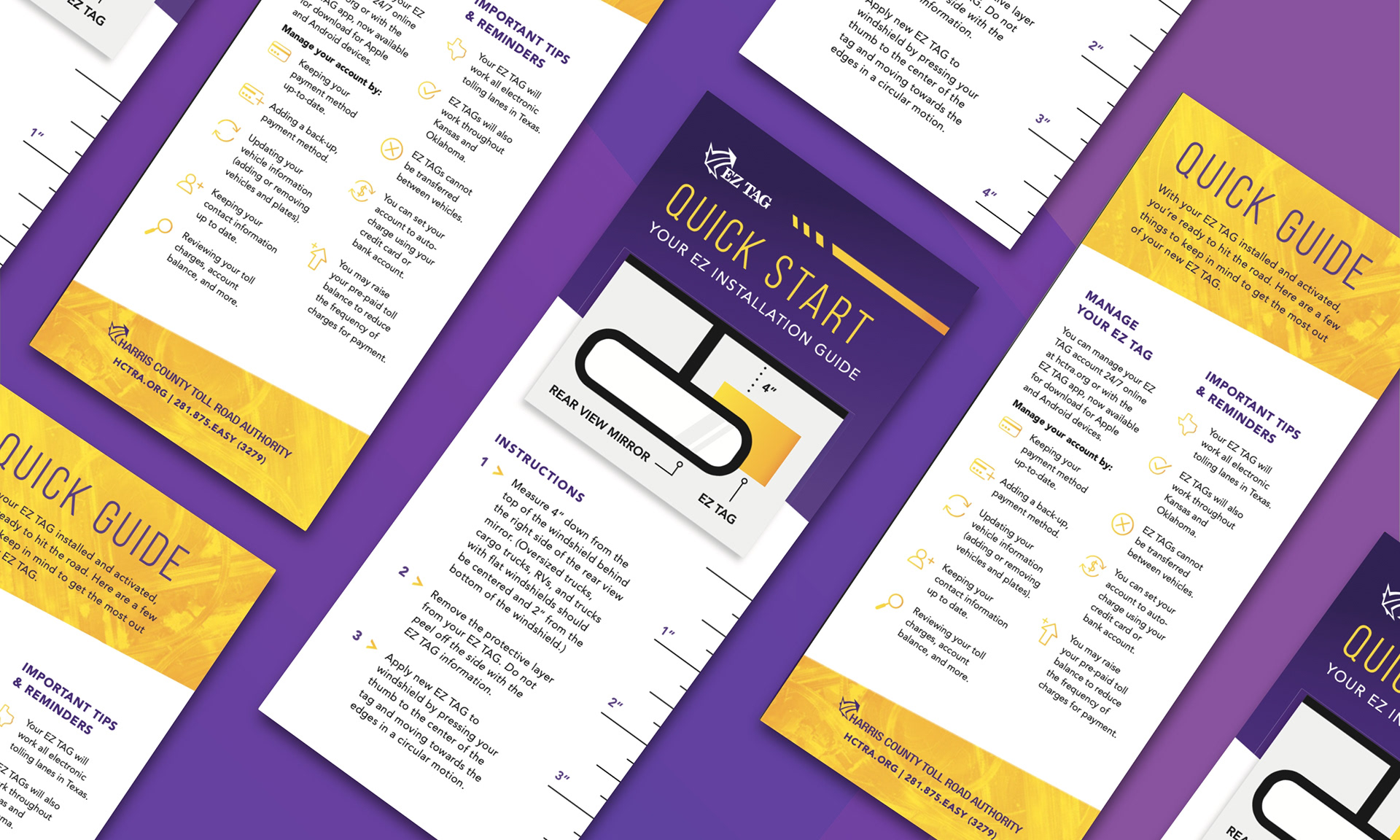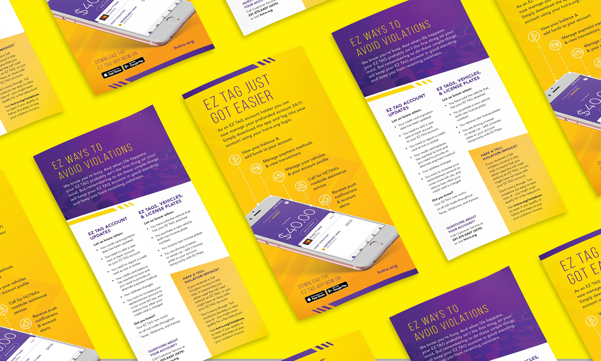 The Harris County Toll Road Authortiy (HCTRA) needed to redesign their core materials to match their new brand and messaging. The materials convey the ease of using an EZ TAG and the goal of helping Houston drivers to keep moving.