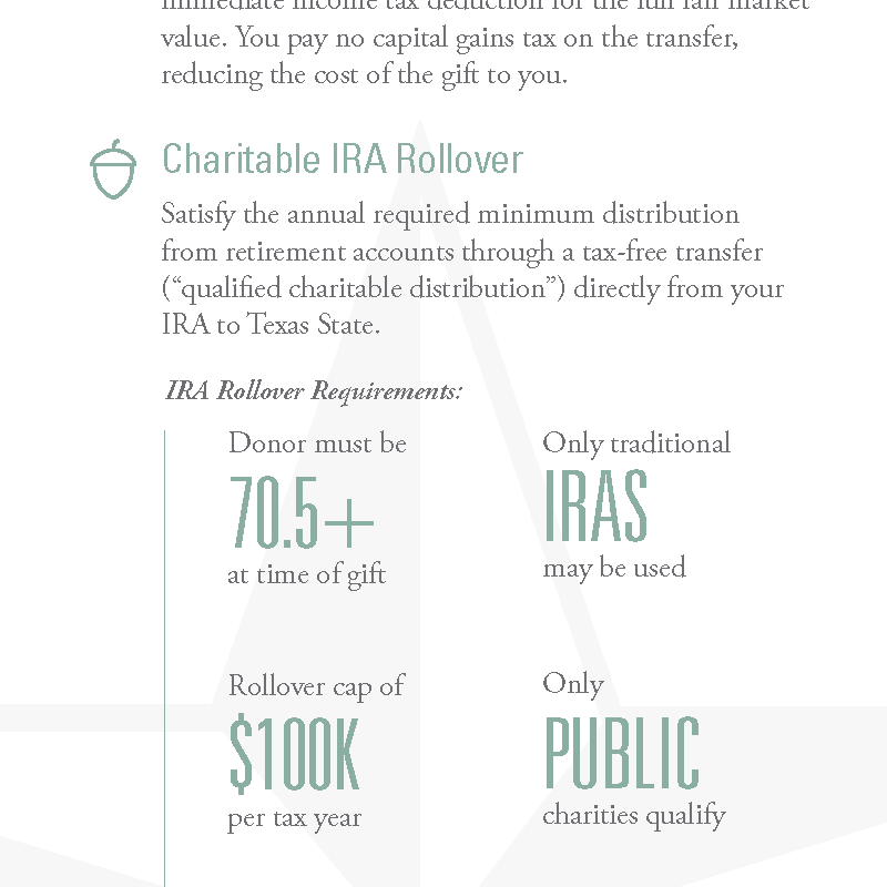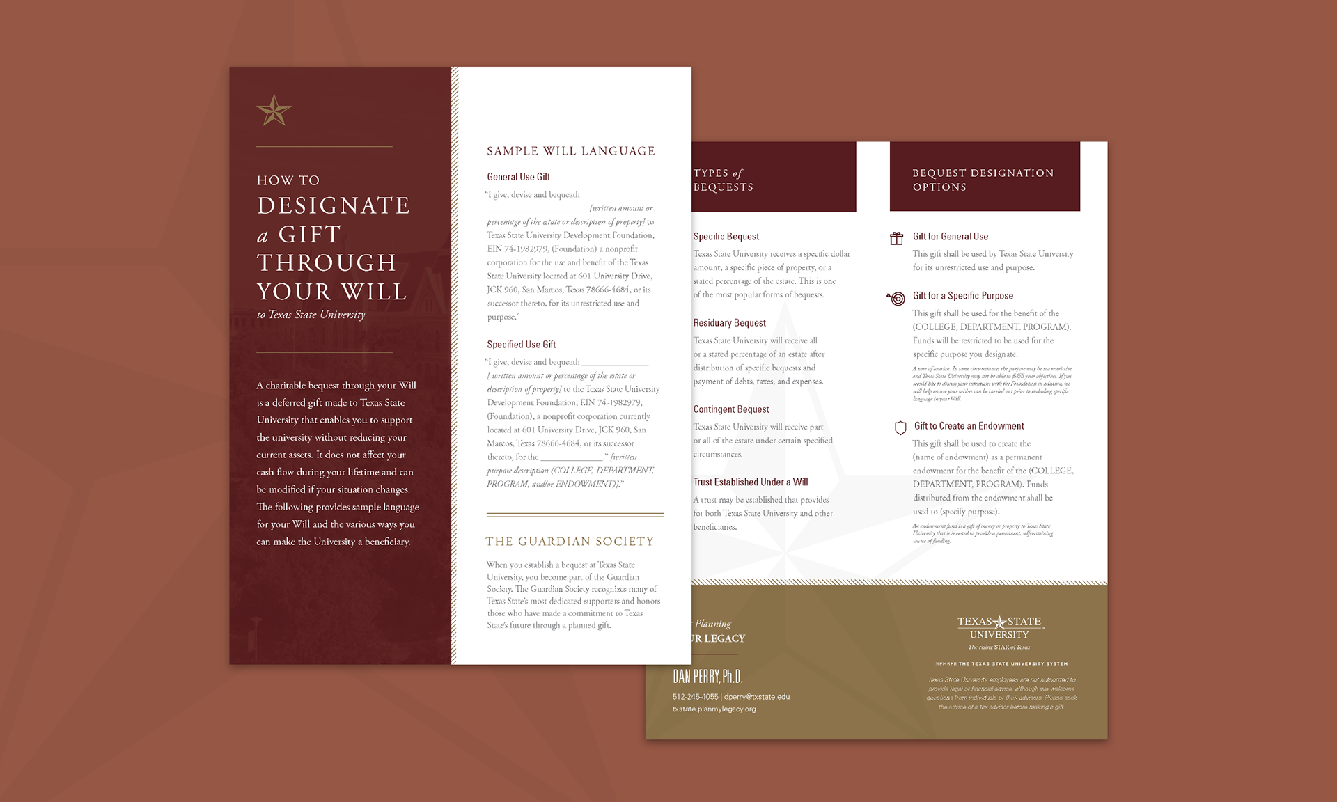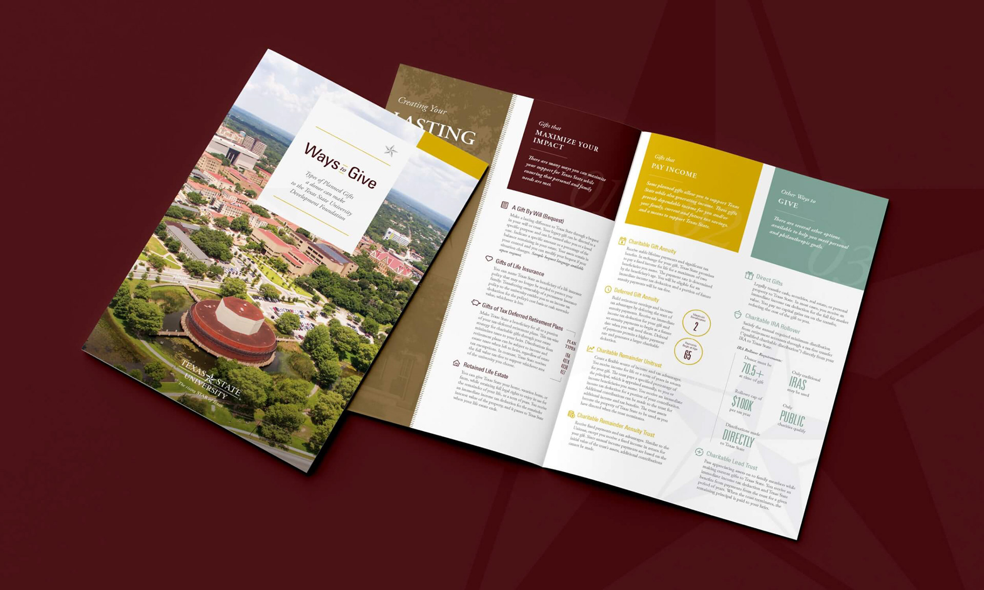 Texas State University at San Marcos reached out for help designing a series of brochures and flyers detailing ways for Alumni and philanthropists to maximize their charitable donations to the school.